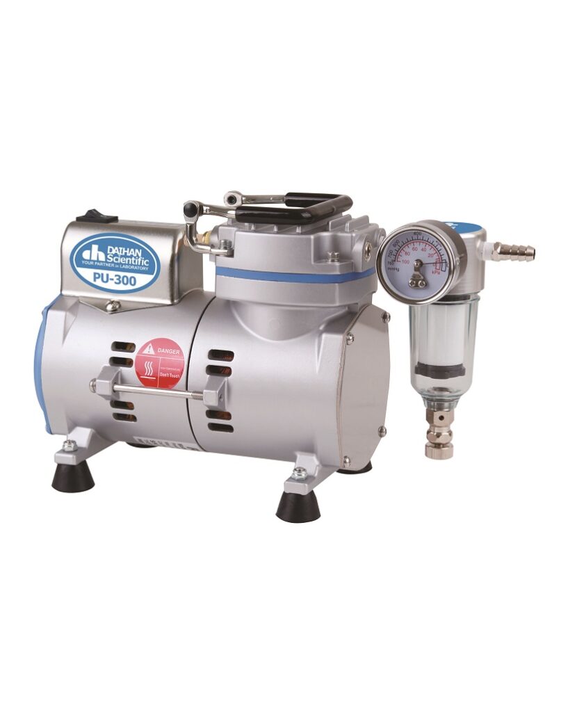 La bomba PU-300 es una bomba de vacío con diafragma libre de aceite fabricada en aluminio, garantiza un mantenimiento mínimo, accionadas por pistón sin lubricante y el cambio de aceite se hace de manera regular, equipado con un sistema ProteTM para protección contra desbordamiento y evitar que una cantidad de líquido sea succionada hacia la bomba, además actúa en caso de sobrecalentamiento, por otro lado tiene un cartucho de filtro en la entrada de aire para filtrar partículas y prolongar la vida útil de la bomba.